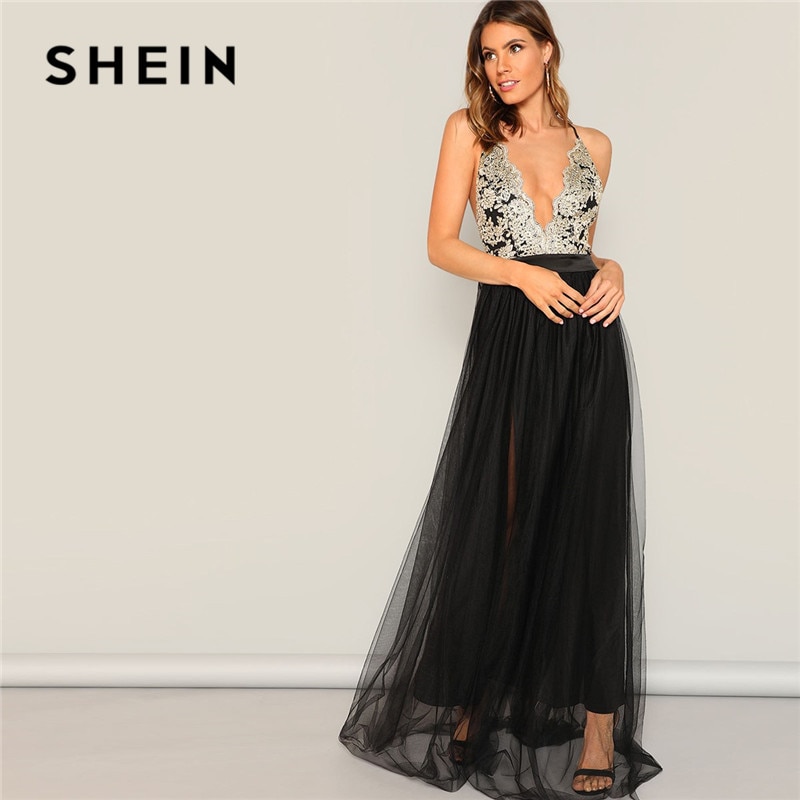 SHEIN Sexy Crisscross Back Mixed Media Deep V Neck Flowy Maxi Dress Summer Lady Sleeveless Halter Embroidery A Line Party Dress
